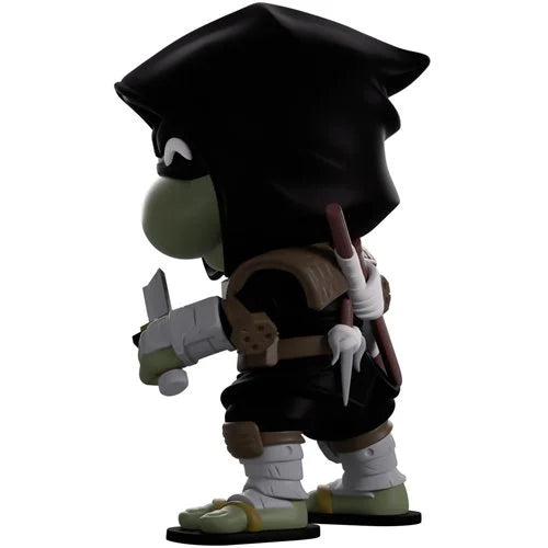 The Last Ronin arrives at Youtooz to search for clues on his quest for revenge! Standing at almost 5-inches tall with a dark grey hood covering his head and falling down to create a shadow over a frowning dark green face as a black mask wraps over his eyes. He holds a shattered blade in his left hand while the right brandishes a sharp sai. With brown armour firmly secured to his shoulders, arms and knees over a flowing cloak, his brother's weapons are strapped to his back and waist as metal plates cover his arms and legs. The exterior of his packaging looks over his shoulder as he gazes upon his brother's old weapons and masks, while the interior is pitch black with their shadowy figures peering out. The protective sleeve is surrounded in a bright red city skyline as a fine mist splatters across its front and his figure can be seen through the large clear window at the packaging's front.